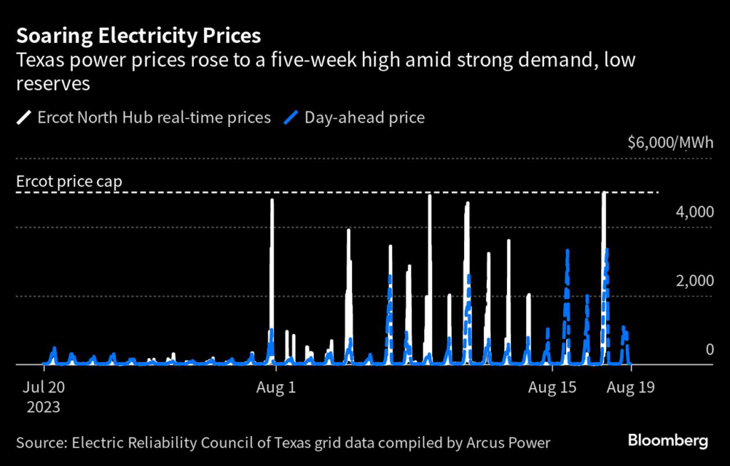 (Bloomberg) — Texas spot electricity prices soared by more than 60-fold, climbing toward the $5,000 price cap as the state grid faces some of the tightest conditions for power supplies so far this summer.