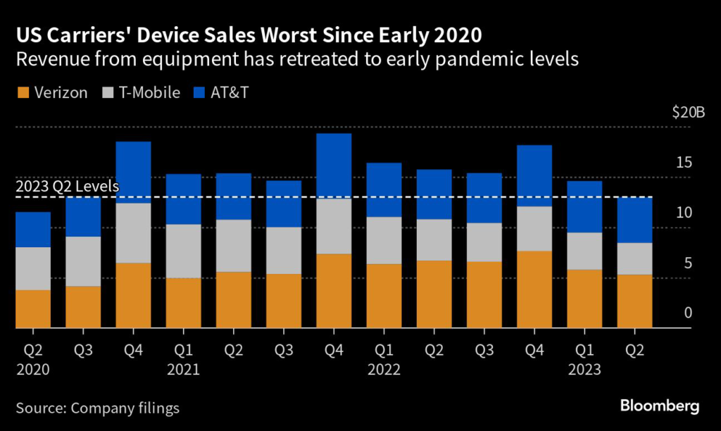 (Bloomberg) — The top three US wireless carriers have lost billions in revenue as smartphone sales dwindle in a reversal of the pandemic boom.