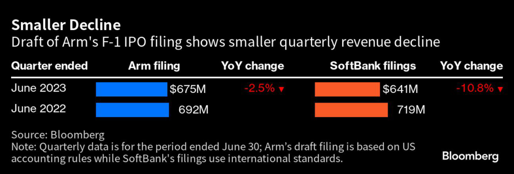 Arm’s draft filing also shows that sales for the quarter ended June 30 fell 2.5% to $675 million under US standards. That’s a smaller drop than SoftBank reported earlier this month, when it said sales for the unit fell about 11% to $641 million under IFRS.