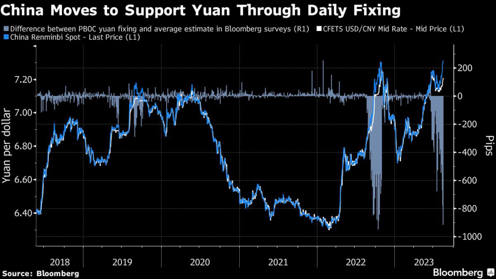 (Bloomberg) — China delivered its strongest ever pushback against a weaker yuan via its daily reference rate for the managed currency, as it sought to restore confidence to a market spooked by disappointing data and heightened credit risks.