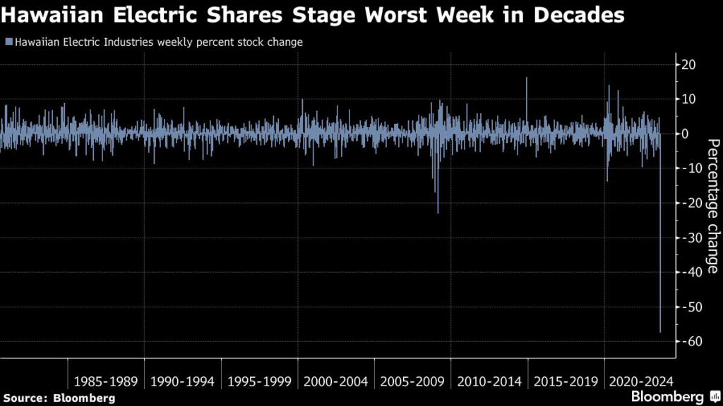 Hawaiian Electric Industries Inc. shares notch the worst weekly drop in at least four decades on concern it may be responsible for the fires that ravaged the island of Maui, with Wells Fargo’s analyst warning the possible liabilities could be large enough to wipe out the value of its utility arm.