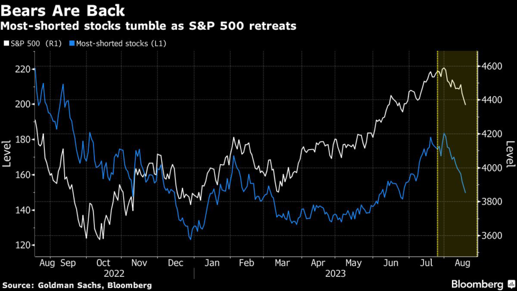 The benchmark index is down 5% in August, while a basket of most-shorted stocks kept by Goldman has fallen 18%, handing profits to bears.