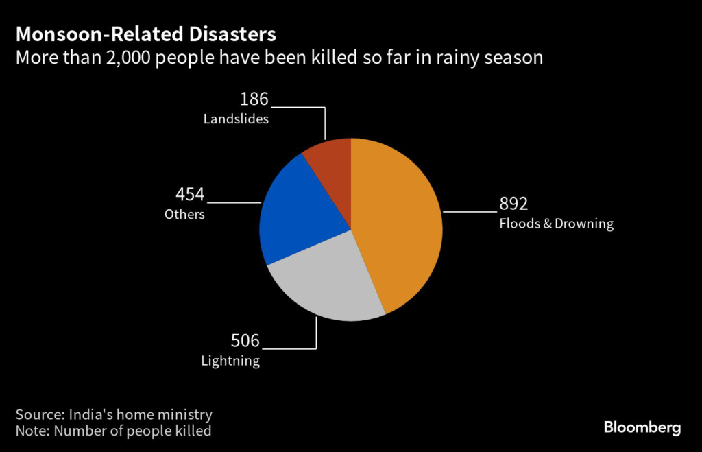 (Bloomberg) — Some regions of India are bracing for more torrential rain, raising the risk of further causalities after natural calamities such as floods and lightning killed 2,000 people during the current monsoon season.