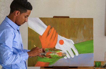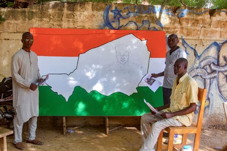 Members of a small painting collective worked under the shade of trees in a quiet corner of Niamey to make a portrait of coup leader Abdouharamane Tiani on an outline of Niger, adding a protester here, an inspirational quote there.