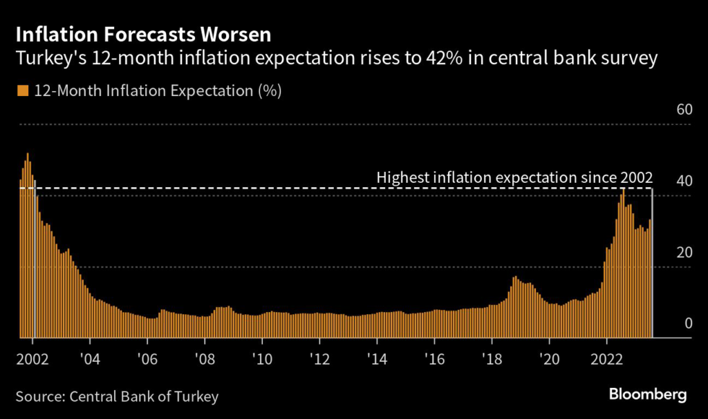 (Bloomberg) — Turkey’s inflation outlook is worsening due to a weak currency, with a key survey by the country’s central bank showing analysts expect the fastest predicted price gains in more than two decades.