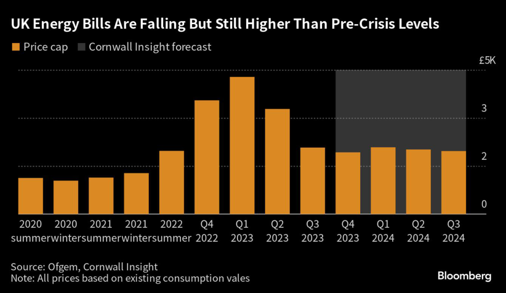 (Bloomberg) — Energy bills for UK households are forecast to decline 7% starting in October, taking the typical annual bill below £2,000 ($2,543) for the first time in a year.