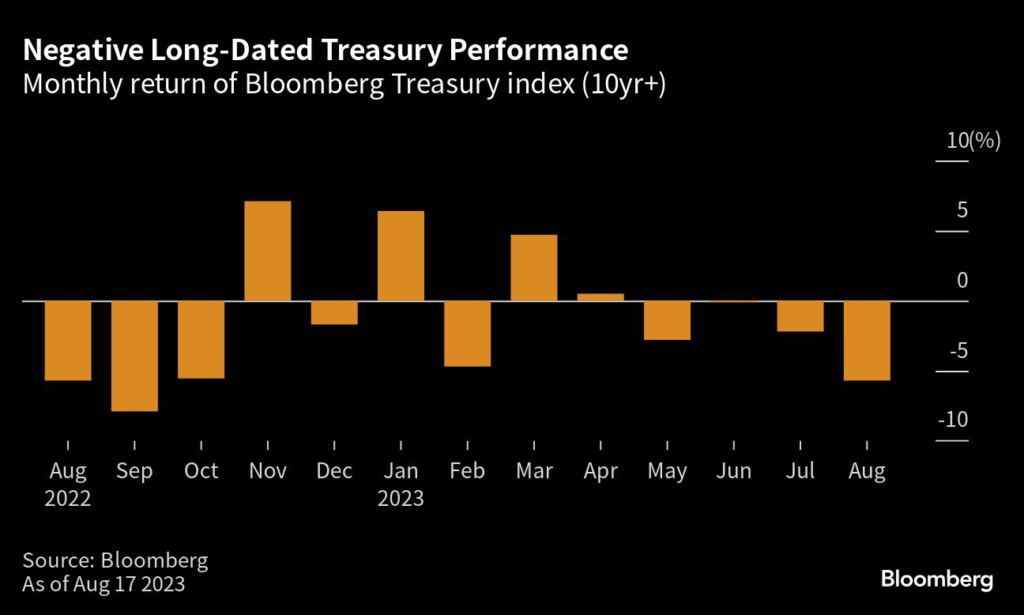 The pain is registering acutely for bondholders, with a Bloomberg index comprised of Treasuries maturing in 10 years and more slumping 5.7% so far in August, on course for its worst month since September.