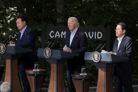 CAMP DAVID, Maryland (Reuters) -U.S. President Joe Biden, Japanese Prime Minister Fumio Kishida and South Korean President Yoon Suk Yeol made several pledges in an historic Camp David meeting, and issued sharp rebukes to China and Russia: