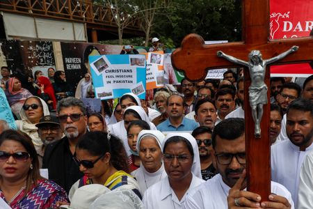 LAHORE, Pakistan (Reuters) – Pakistani Christians held services on Sunday at churches that were vandalised and torched by a vigilante mob last week after two Christian brothers were accused of desecrating the Koran.