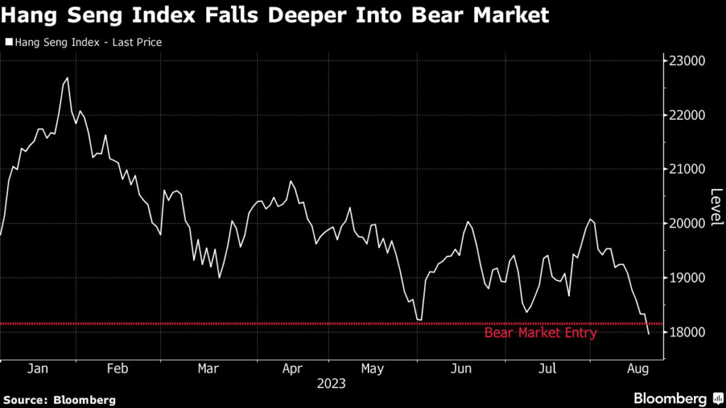 The Hang Seng Index, which fell into a bear market on Friday, slid for a seventh straight day, the longest losing streak since November 2021.