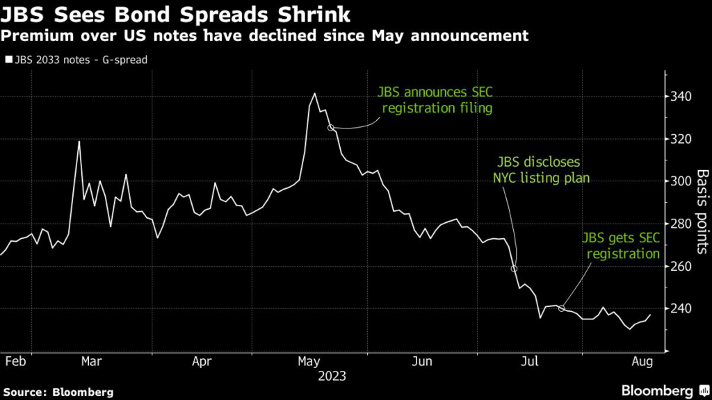 JBS SA’s decision to submit its business to increased US scrutiny appears to be paying off with debt investors, as the bonds of the world’s largest meat packer are largely outperforming those of its peers.