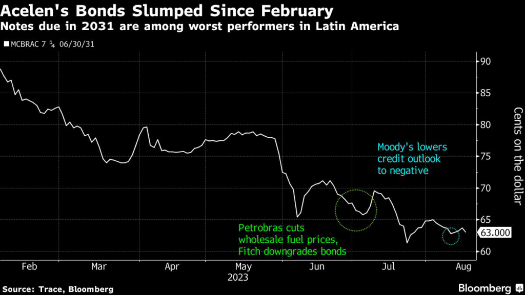 Mubadala’s Acelen, which operates the refinery in northeast Brazil, saw its notes fall into distressed territory at around 63 cents on the dollar, down 26 cents since February.