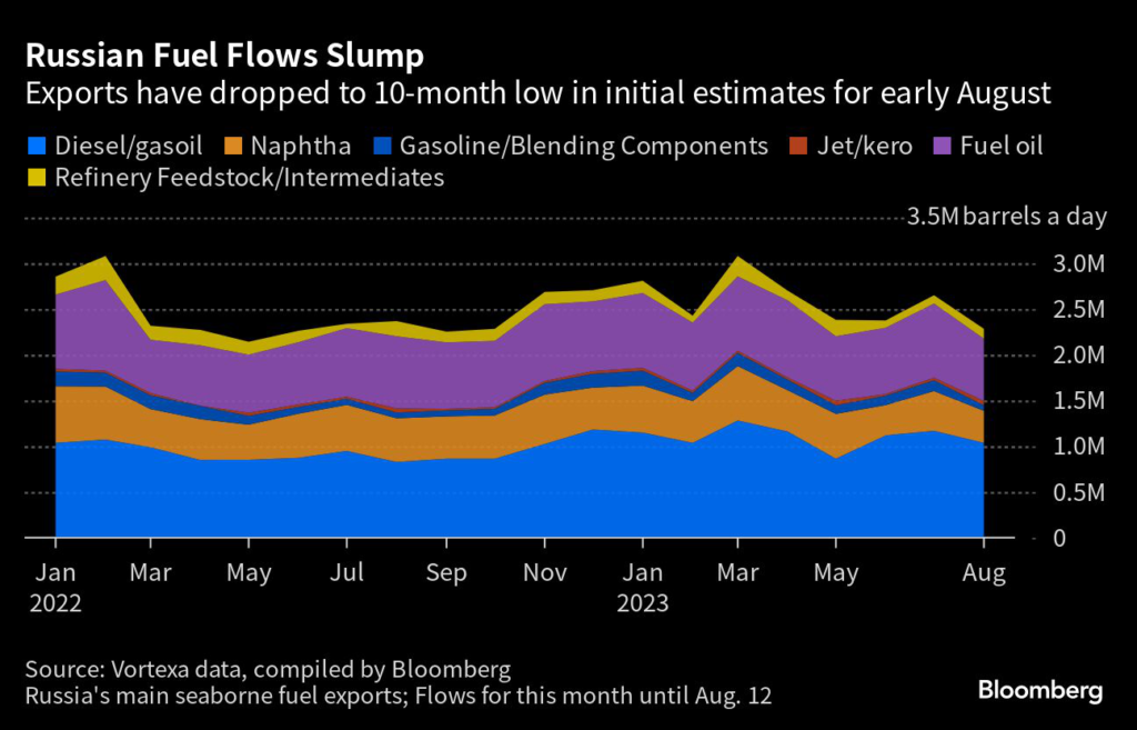 Shipments of Russia’s main products — including diesel, fuel oil and naphtha — dropped in the first 12 days of August, according to Vortexa Ltd.