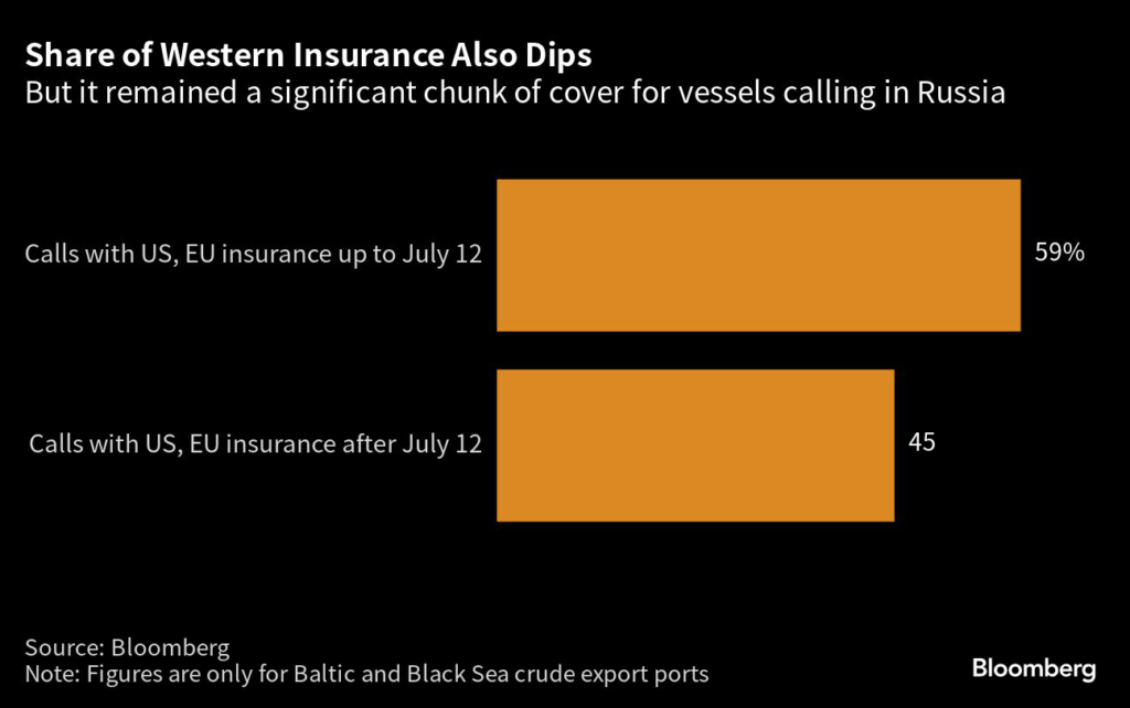 There has also been a drop off in the number of ships calling at Russian ports with industry-standard insurance from members of the International Group of P&I Clubs, which itself is based in London.