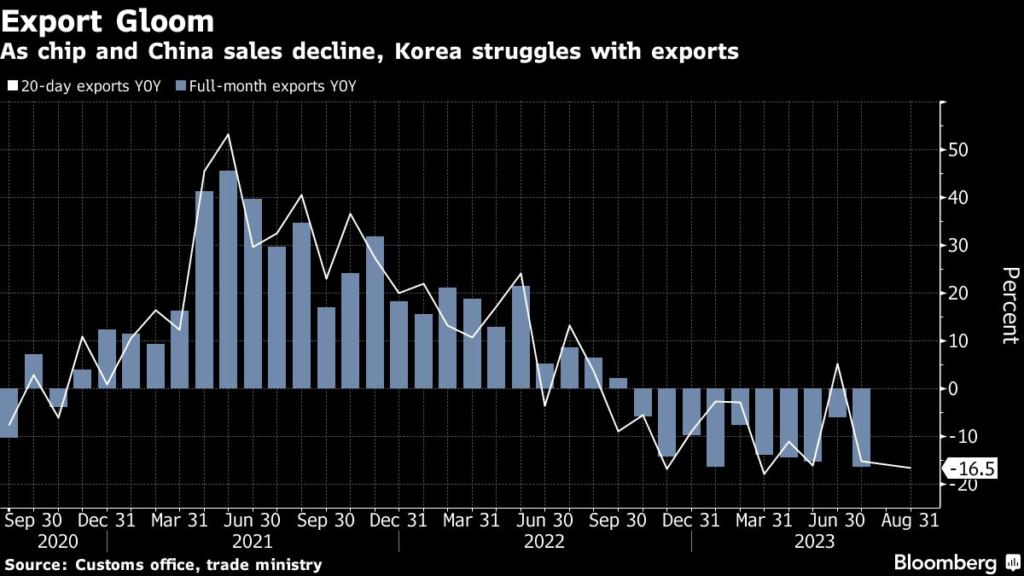 (Bloomberg) — South Korea’s early exports kept declining in August in the latest sign of lackluster global trade weighing on economic growth.