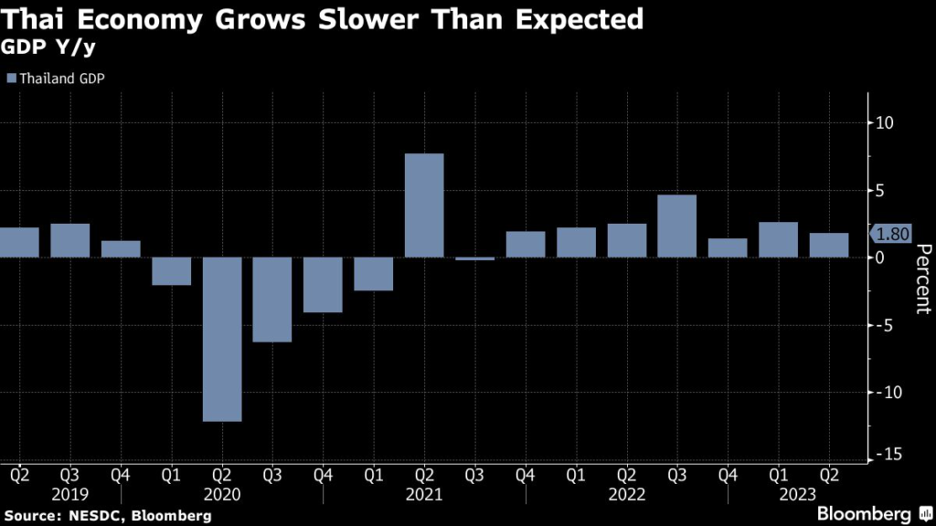 (Bloomberg) — Thailand’s economy expanded at a slower pace than forecast, making a case for the central bank to pause its monetary tightening to support growth in the face of an exports downturn and a political impasse.