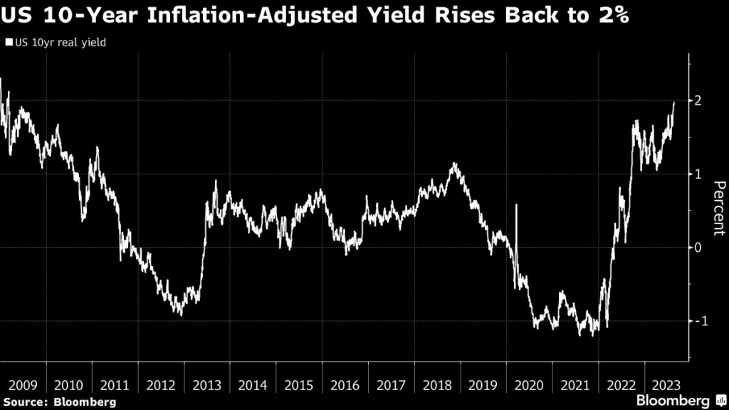 (Bloomberg) — The US bond-market selloff resumed Monday, driving 10-year yields to a 16-year high, as the persistently resilient economy has investors positioning for interest rates to remain elevated even after the Federal Reserve winds up its hikes.