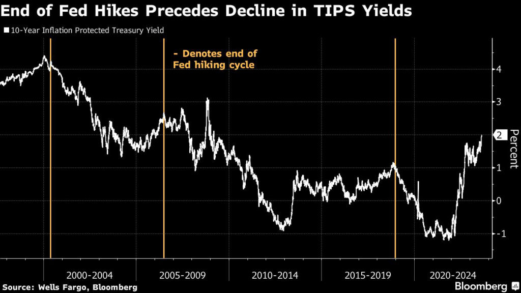 Wells Fargo found that 10-year real yields dropped by an average of 26 basis points in the three months following the final hike of the Fed’s three most-recent cycles — in 2000, 2006, and 2018 — and that yields fell 39 bps when looking at a six-month period.