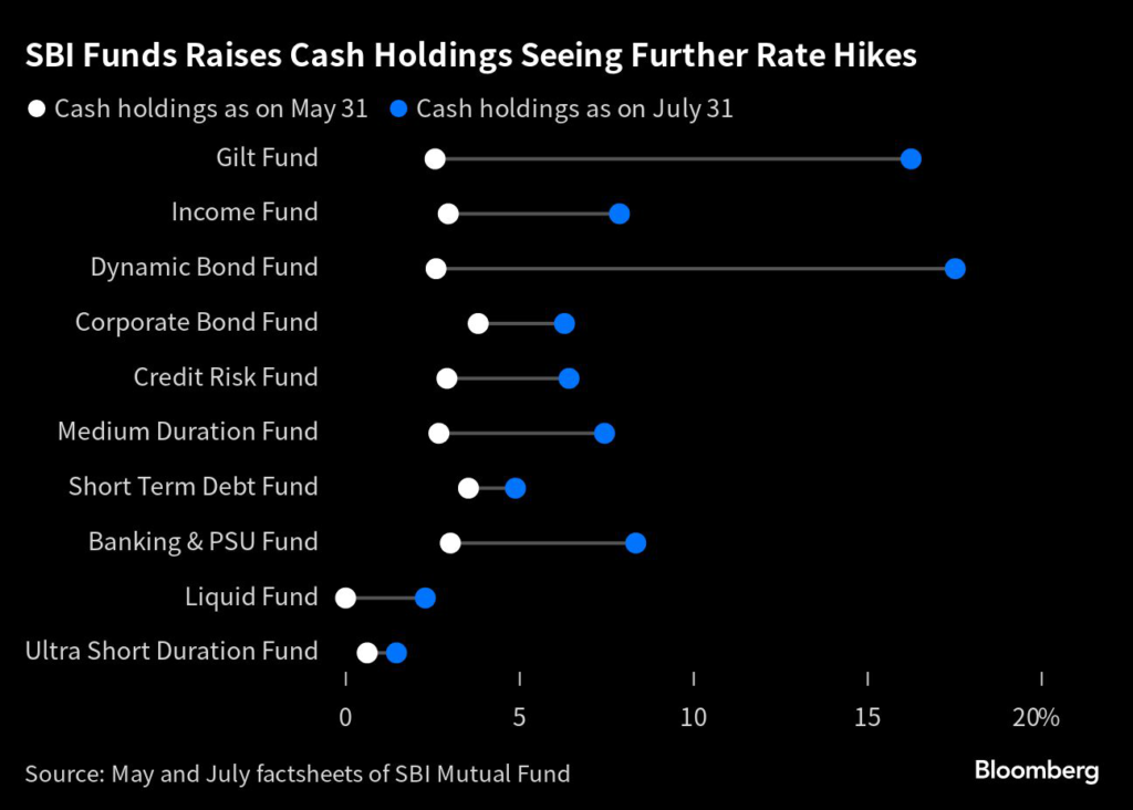 The cash component of SBI’s Dynamic Bond Fund, which invests across durations, saw one of the biggest increases among the various debt plans offered by the asset manager.