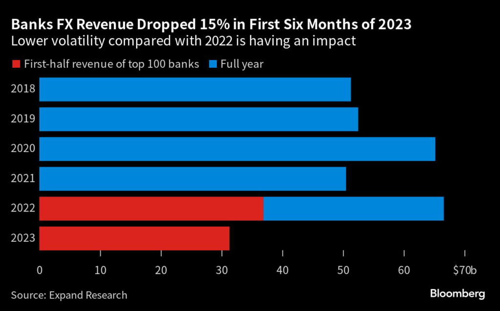 The macro-uncertainty has also seen some clients retreat from the market, and spot FX volumes fell 7% in the first half of 2023, according to Expand.