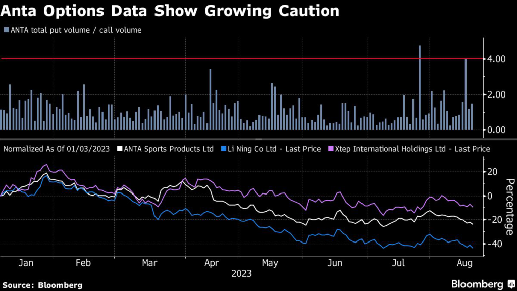 In the options market, Anta’s put-to-call volume ratio surged to over four times — the second highest reading for the year — on Wednesday, a sign of increasing bearishness.