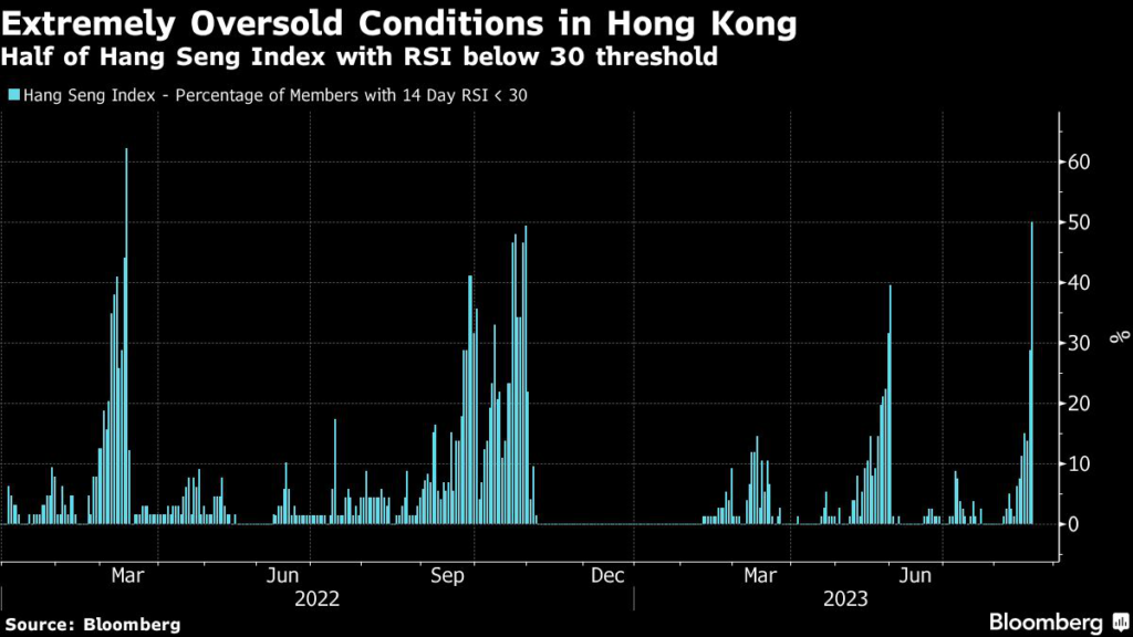 Among the 80-member Hang Seng Index, 42 stocks saw their 14-day relative strength index fall below 30 — a level that indicates shares are oversold. The ratio was the highest since March 2022.