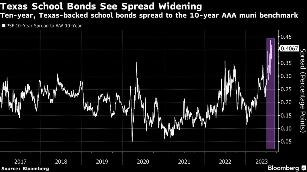 Ten-year Texas school-district bonds enhanced by the state’s guarantee program are yielding roughly 41 basis points over the AAA benchmark, more than double the average spread over the last five years and near the widest on record, according to data compiled by Bloomberg.