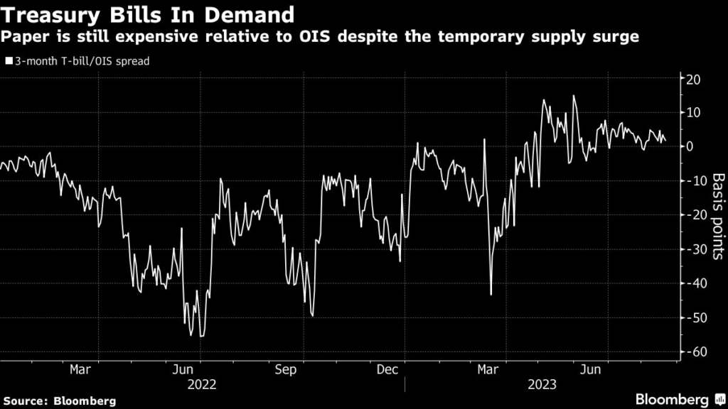 Money-market funds — the largest buyer of the paper — scooped up securities, using cash parked at the Federal Reserve’s reverse repurchase agreement facility to finance T-bill purchases. However, other investors faced with uncertainty over the economy and the US central bank’s policy path have piled into short-term debt that yields more than 5%.
