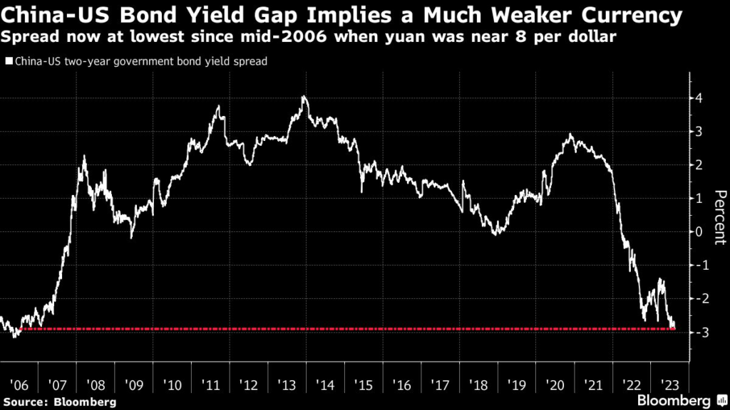 Two-year Treasuries now yield about 290 basis points above Chinese government bonds of the same maturity, a level last seen in mid-2006.
