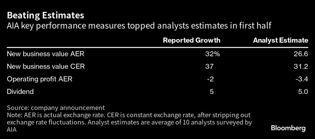 New business value rose 32% in the six months to June 30, the Hong Kong-based insurer said in a statement Thursday.