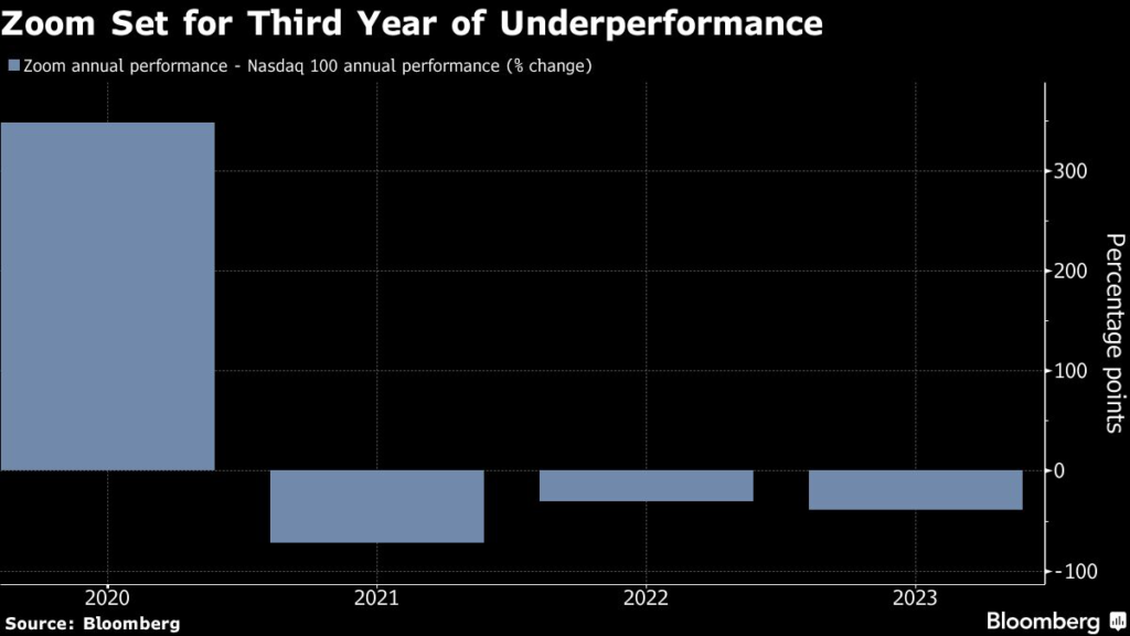 Zoom’s shares are down 2.1% so far this year, on course to underperform the Nasdaq 100 Index for a third-straight year.