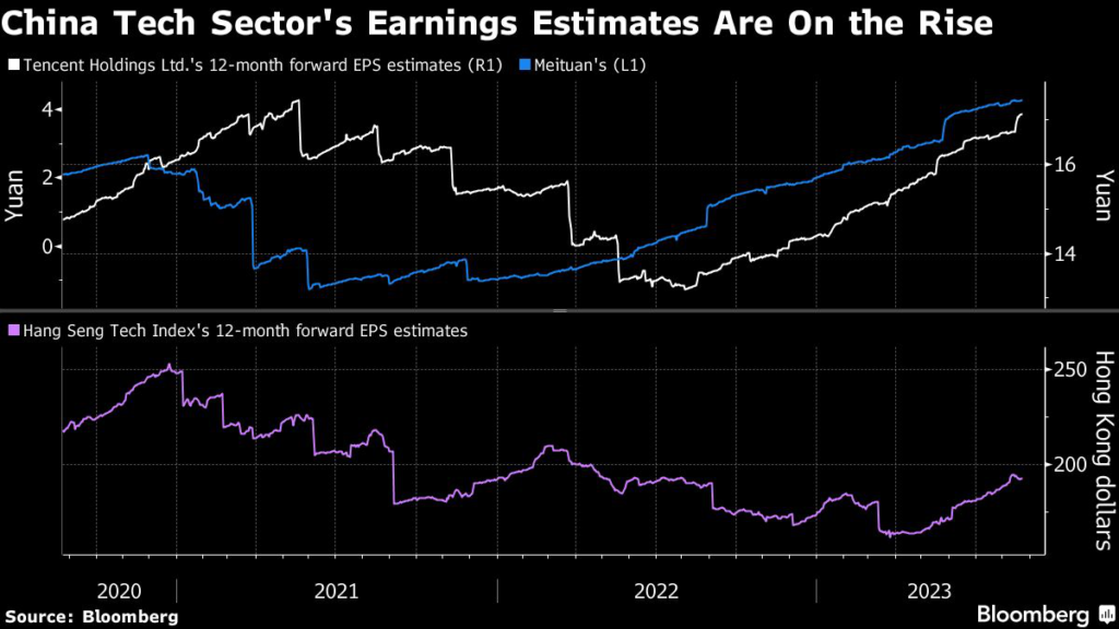 to Baidu Inc. reporting consensus-beating earnings. Forward profit estimates for gaming bellwether Tencent Holdings Ltd. have climbed to near an early 2021 peak, while those for food delivery firm Meituan have more than doubled this year, suggesting that confidence is returning after a years-long official crackdown on the sector.
