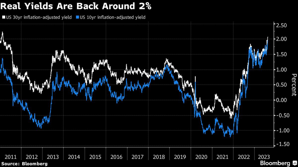 This month, the 30-year TIPS yield shot above 2% for the first time since 2011, while the 10-year benchmark on Monday finally reached 2%, a level last seen in 2009.