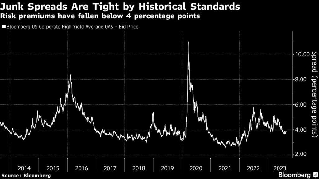 Risk premiums, or spreads, on junk bonds averaged about 3.85 percentage points on Tuesday, close to the lowest level of the year and below the average of the last decade of 4.3 percentage points.