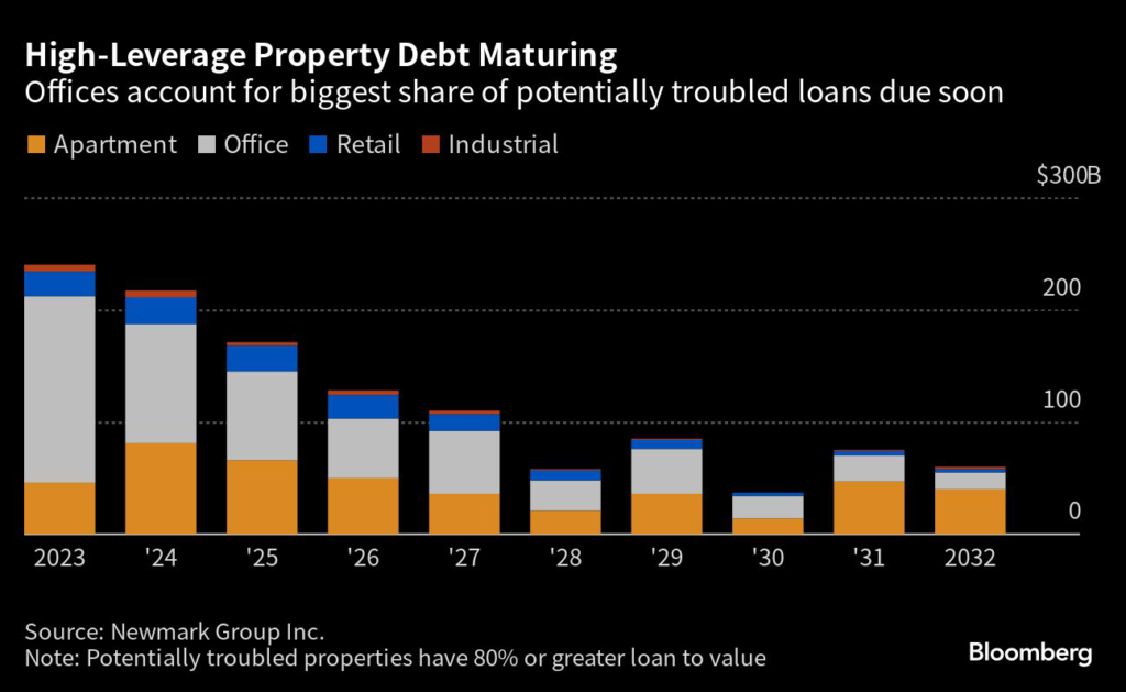 Offices are the biggest near-term problem, accounting for more than half of the $626 billion of at-risk debt that’s set to mature by the end of 2025, the brokerage estimates.