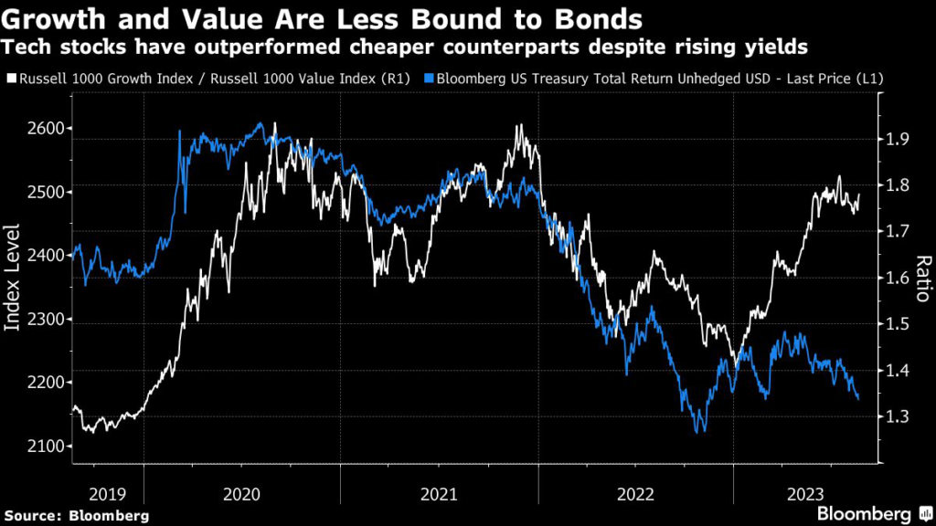 But the broader trend this year is different: The link between 10-year Treasuries and value-growth has slipped.