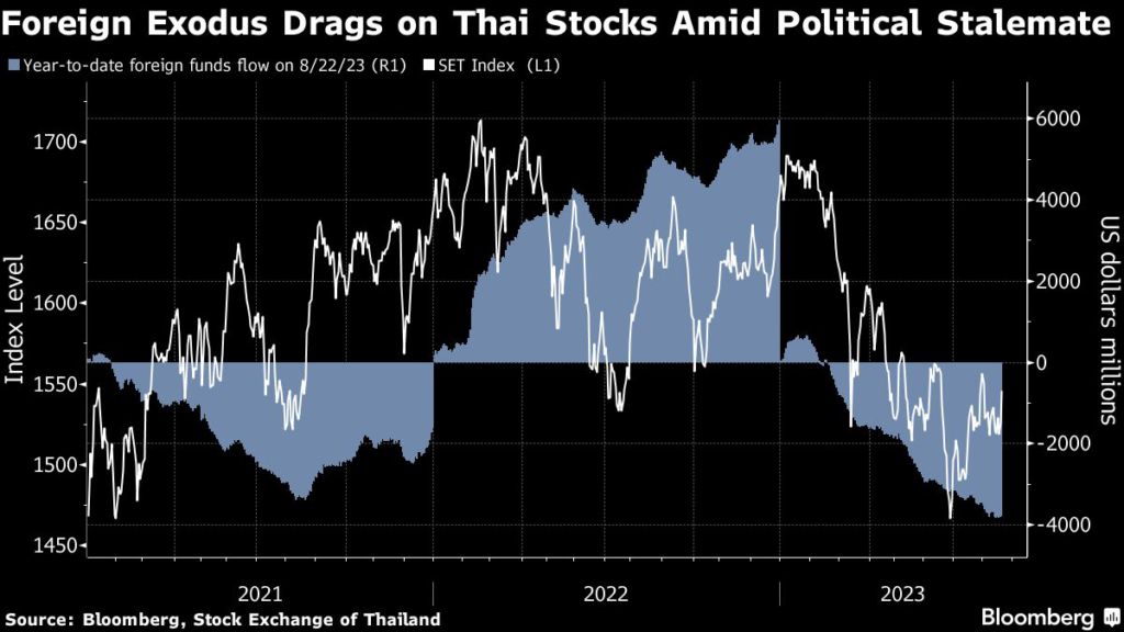 The gauge is still down 7.2% this year. Foreign investors have withdrawn almost $4 billion in 2023 from Thailand’s equities as confidence was eroded by the political stalemate, slowing exports and higher interest rates.