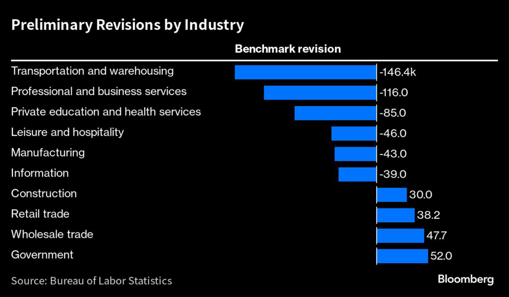 (Bloomberg) — US job growth was probably less robust in the year through March than previously reported, according to government data released Wednesday.