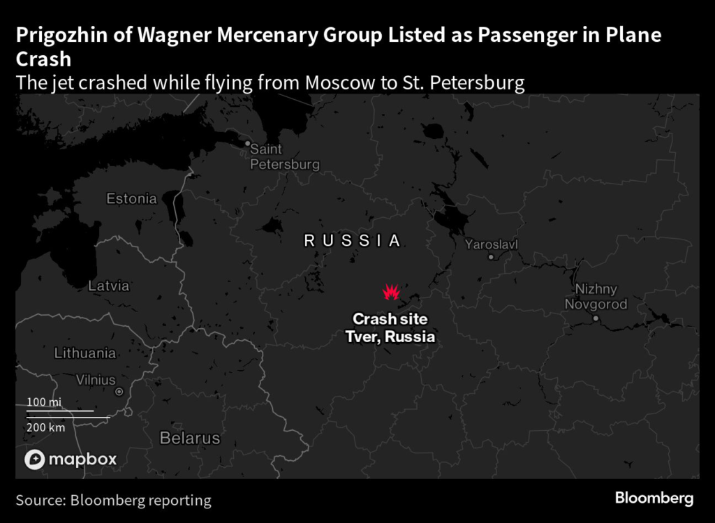 (Bloomberg) — Wagner mercenary group founder Yevgeny Prigozhin was listed among passengers on a private jet that crashed as it traveled from Moscow to St.