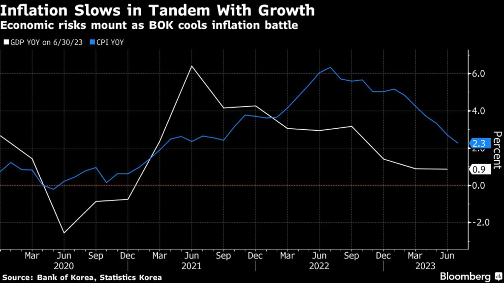 While the BOK largely kept its economic forecasts intact, saying it still expects the economy to expand by 1.4% and consumer prices to rise by 3.5%, it trimmed its 2024 GDP growth forecast to 2.2%, a move that reflects the impact from slowing activity in China.