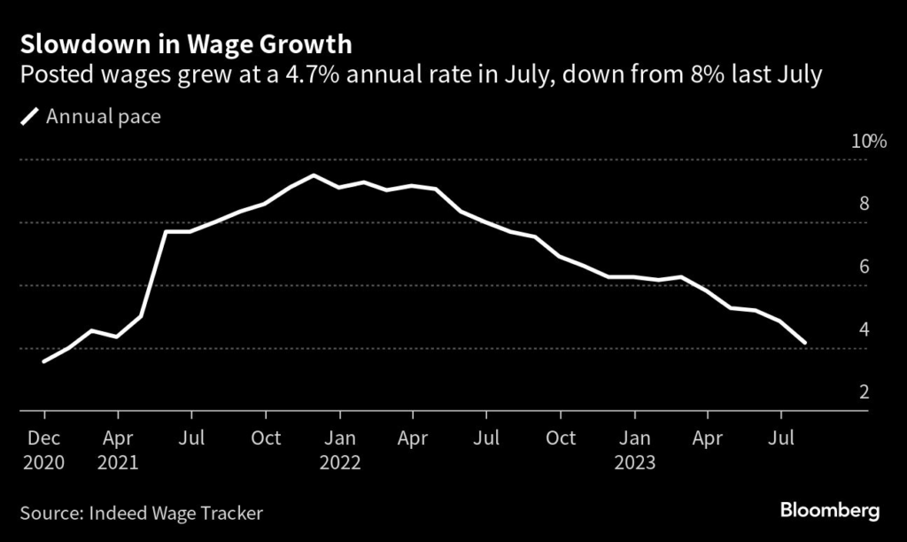 (Bloomberg) — US wage growth continues to slow as inflation comes down, offering encouraging news for the Federal Reserve as its chiefs meet at Jackson Hole, according to job-search website Indeed.