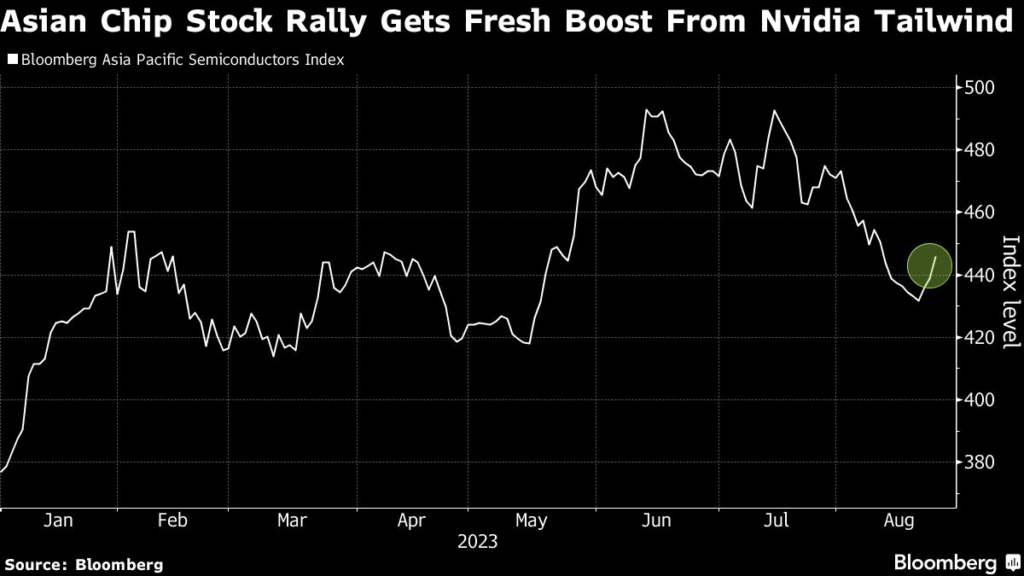 (Bloomberg) — Asian semiconductor stocks got a fresh boost from a stellar set of results at Nvidia Corp., the standard bearer of the artificial intelligence theme that propelled gains in the sector earlier this year.