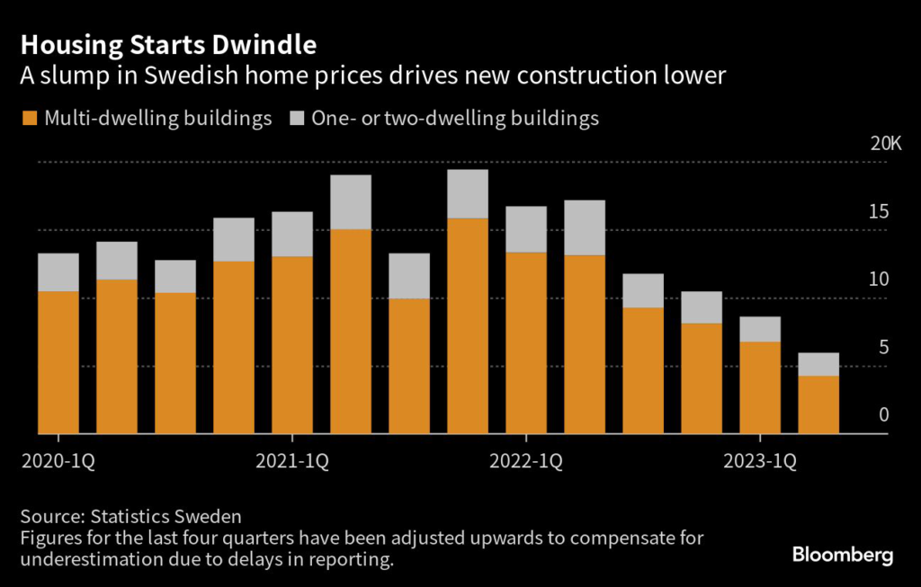 (Bloomberg) — Sweden’s housing starts extended a plunge into the second quarter as lower home prices and rising construction costs put the brakes on building activity.