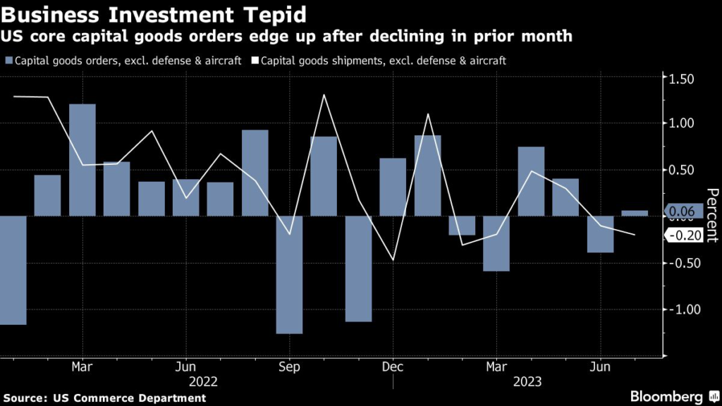 (Bloomberg) — Orders placed with US factories for business equipment increased slightly in July after a downward revision to the prior month, suggesting companies are somewhat cautious about capital investment amid high borrowing costs and economic concerns.