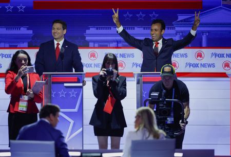 MILWAUKEE (Reuters) -Eight Republican presidential candidates traded barbs on Wednesday at their first debate of the 2024 election as they jockeyed for position behind the absent front-runner, Donald Trump, who derided the event in a pre-taped interview aimed at siphoning away viewers.