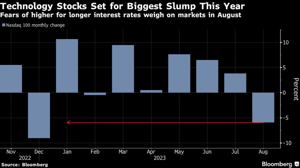 The tech-heavy Nasdaq has slumped in August, and is set for its worst month since December, but is still up 35% this year.