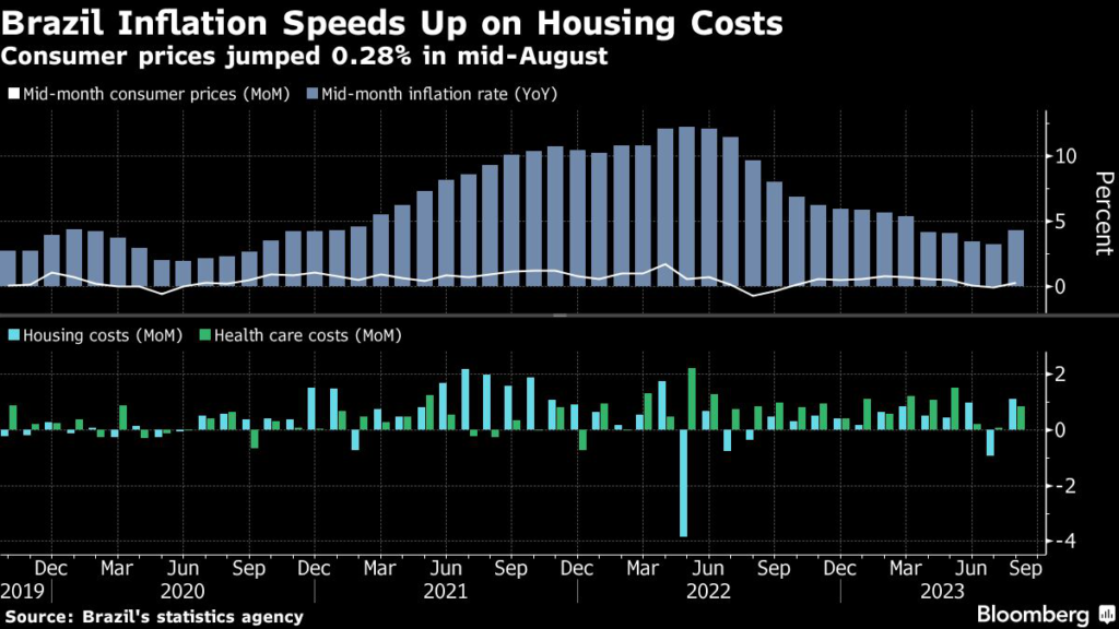 (Bloomberg) — Brazil’s annual inflation sped up more than expected in early August, snapping a 14-month slowdown as the central bank pledges to continue cutting its interest rate.