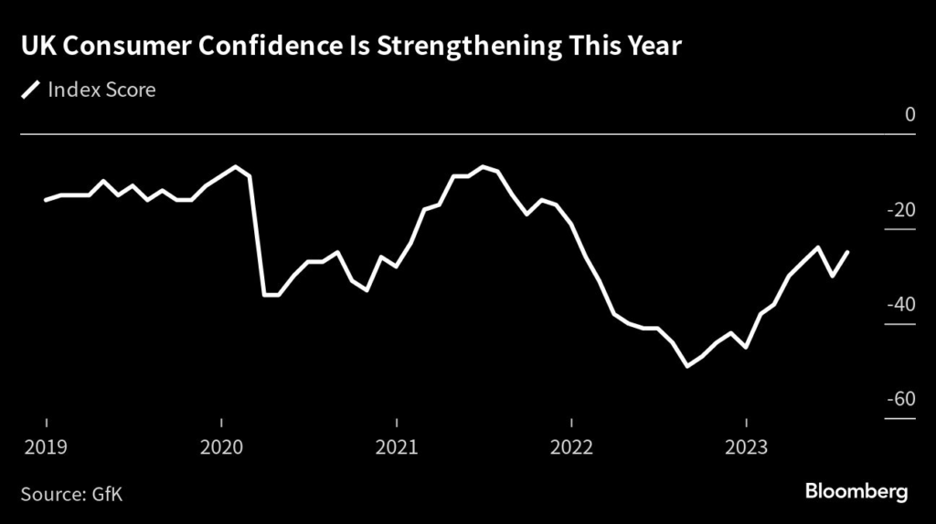(Bloomberg) — UK consumer confidence rebounded in August as inflation showed signs of cooling and strong wage growth buoyed household finances.