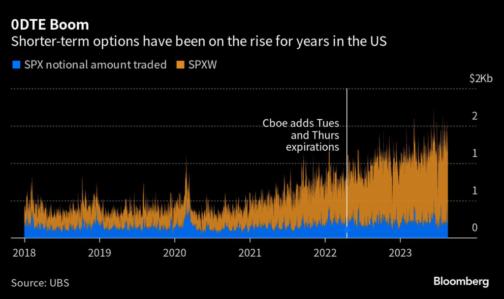 At one point this month 0DTE accounted for a record 55% of the trading volume for options tied to the S&P 500, according to data compiled by Nomura Securities International.