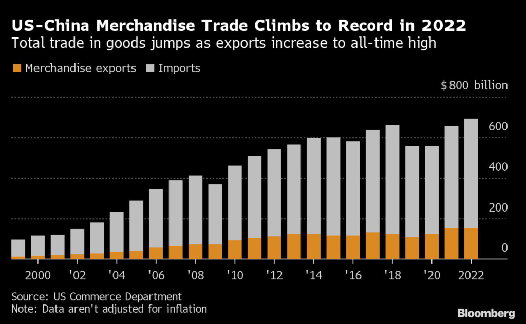 Trade in goods between the US and China climbed to a record $690.6 billion in 2022. US imports from China have dropped this year, though, as it purchases more from Mexico and Canada.